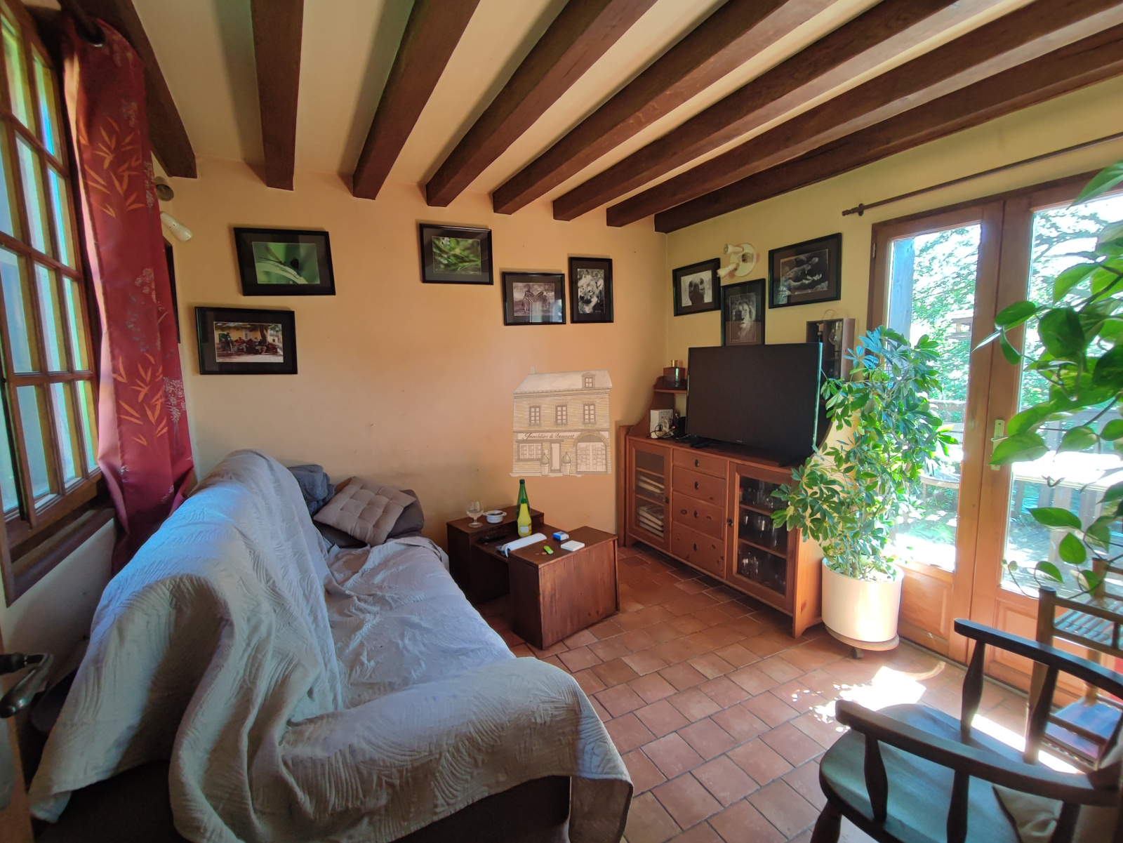 - Au rez-de-chaussée : une salle avec un poêle à bois, une cuisine aménagée avec un accès sur la terrasse côté rivière, un salon ou coin nuit, et une salle de bains avec WC.