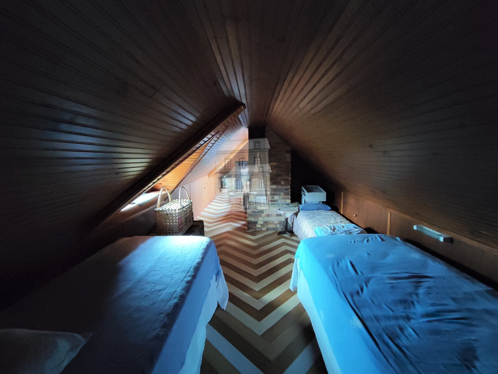 - A l'étage : un grenier aménagé en palier, bureau et 2 chambres (hauteur sous faitage 1m80), donc idéal pour un espace enfant.