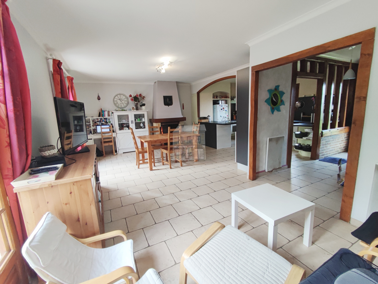 avec sa cheminée/insert et ses deux portes fenêtres donnant sur une terrasse, un couloir dessert trois belles chambres, une salle d'eau avec toilettes et un accès au sous-sol.