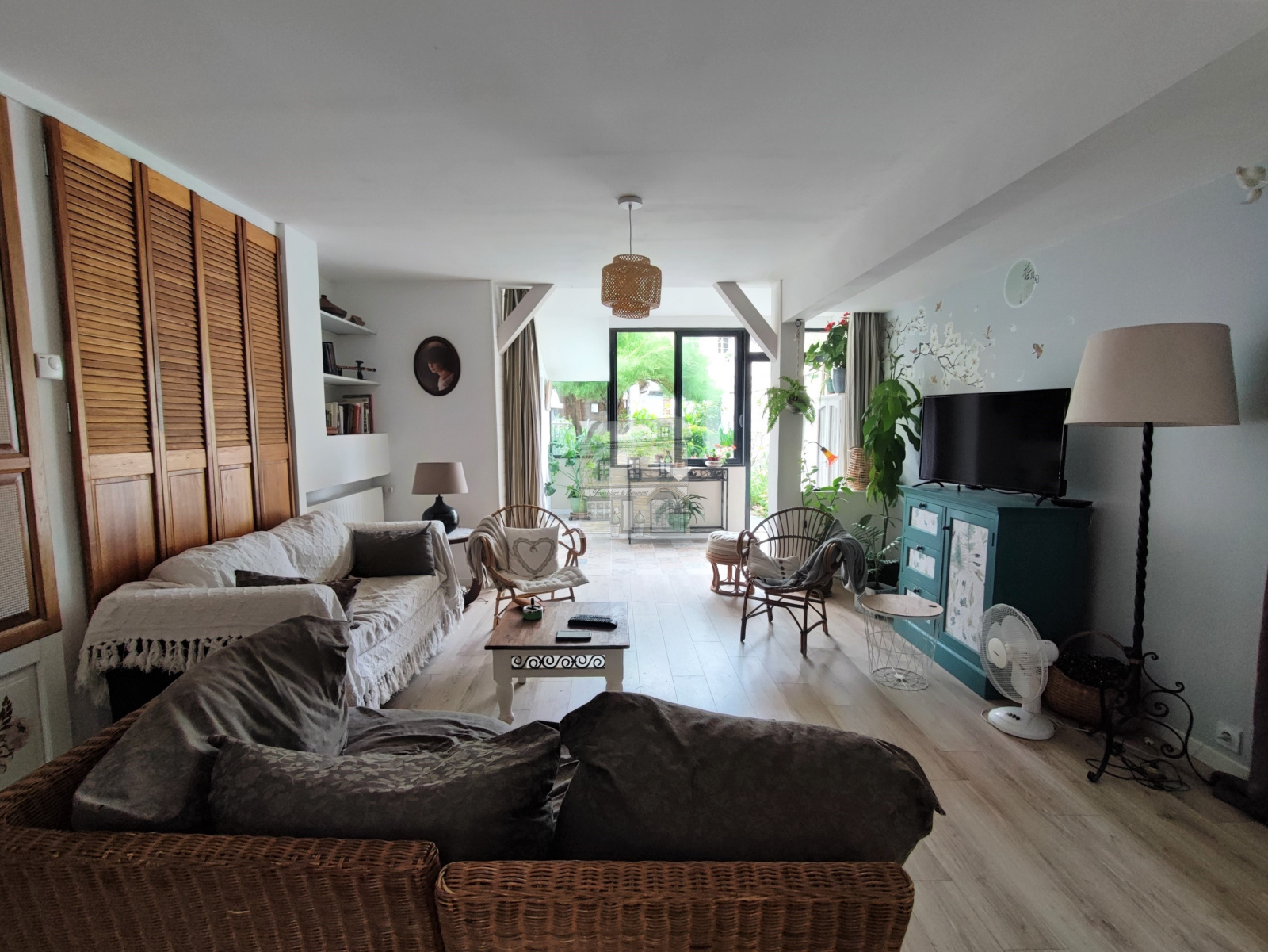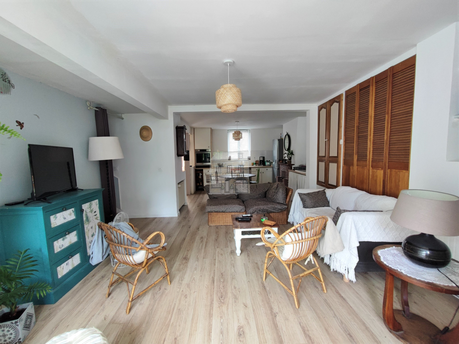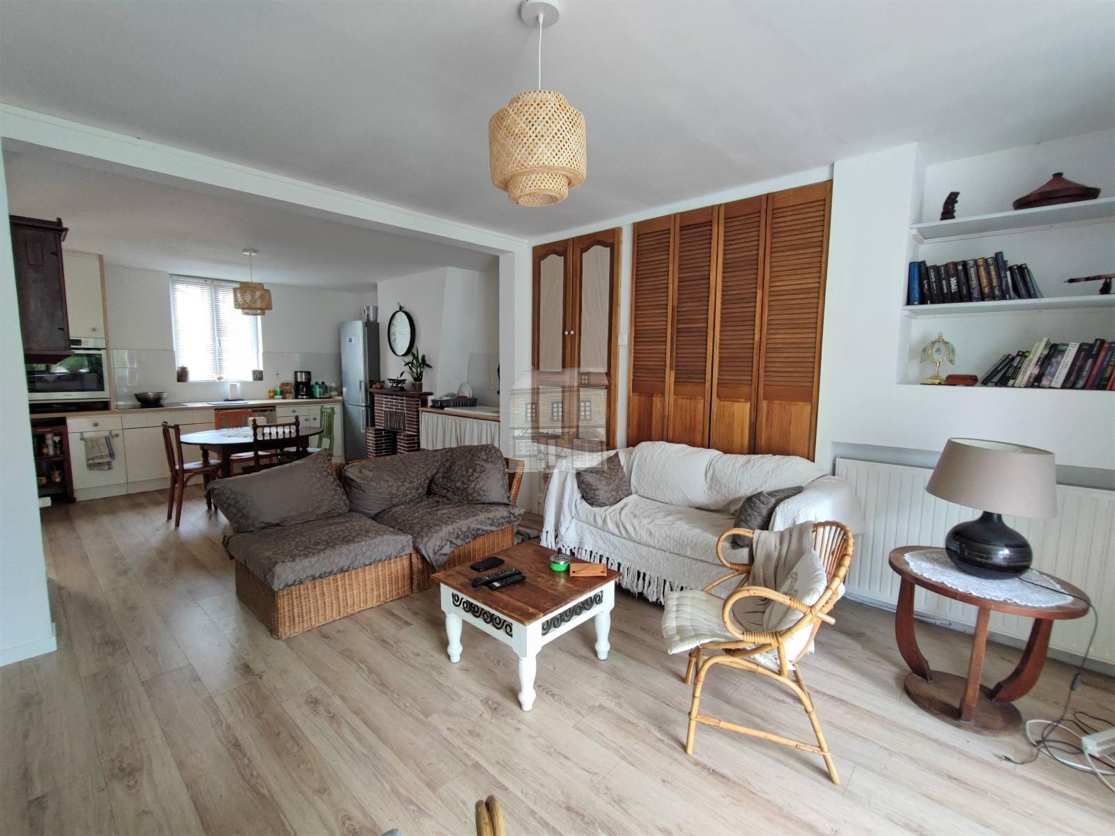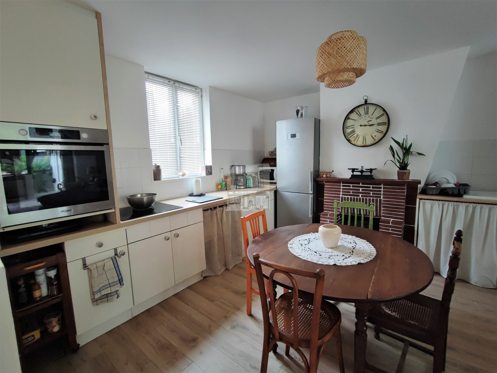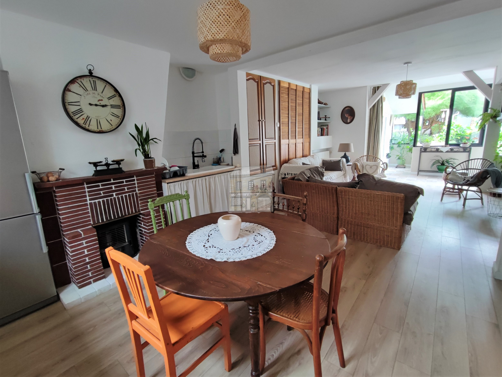 - Au rez-de-chaussée : une entrée avec penderie, une cuisine avec une cheminée ouverte sur une belle salle lumineuse avec placards, WC et une buanderie.