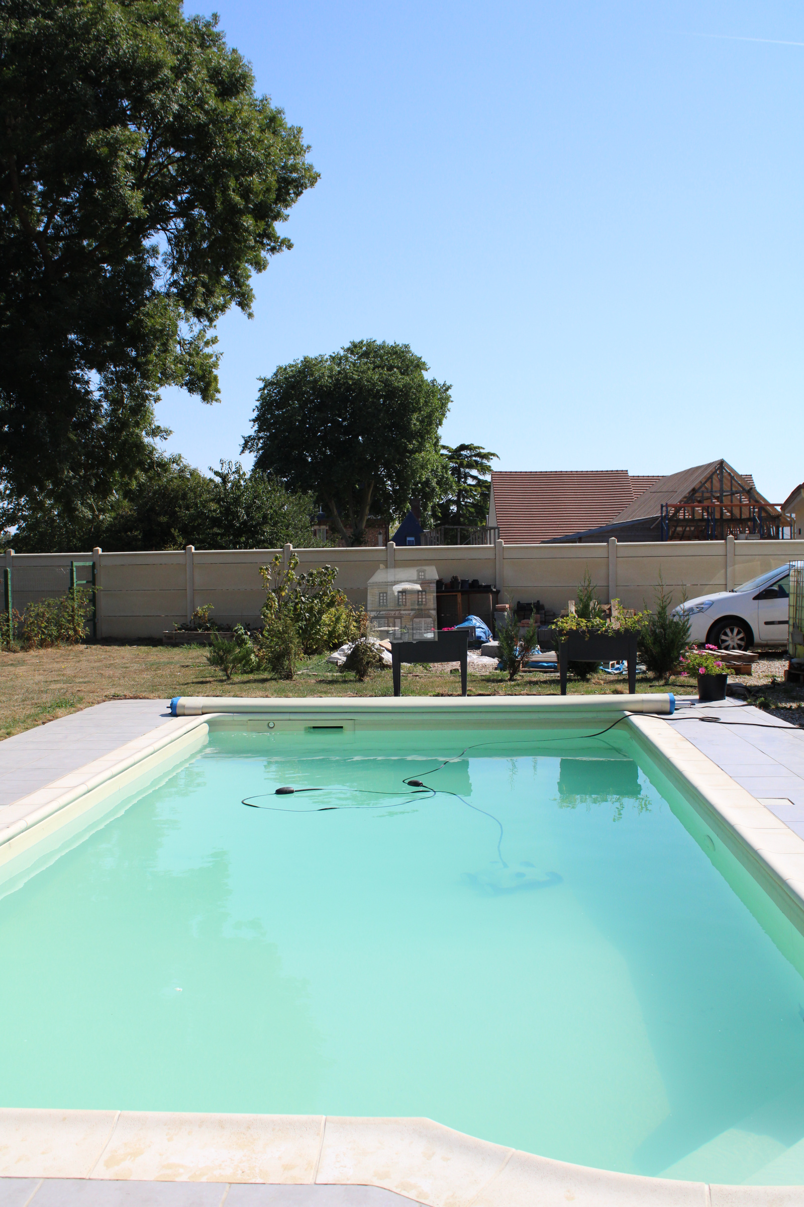 A l'extérieur, se trouve une terasse en bois avec son auvent donnant sur une piscine de 7.66x3.66m de 2015 chauffée par pompe à chaleur.