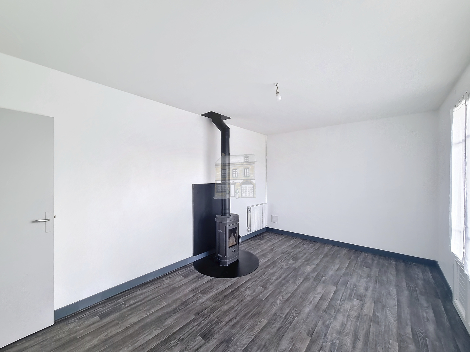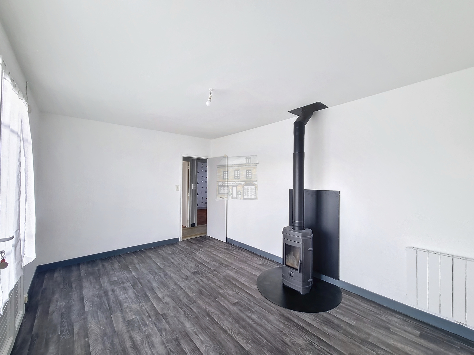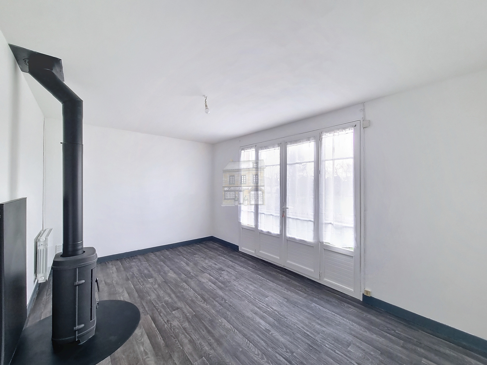 - Un salon lumineux avec un poêle à bois installé en 2021 et balcon ;