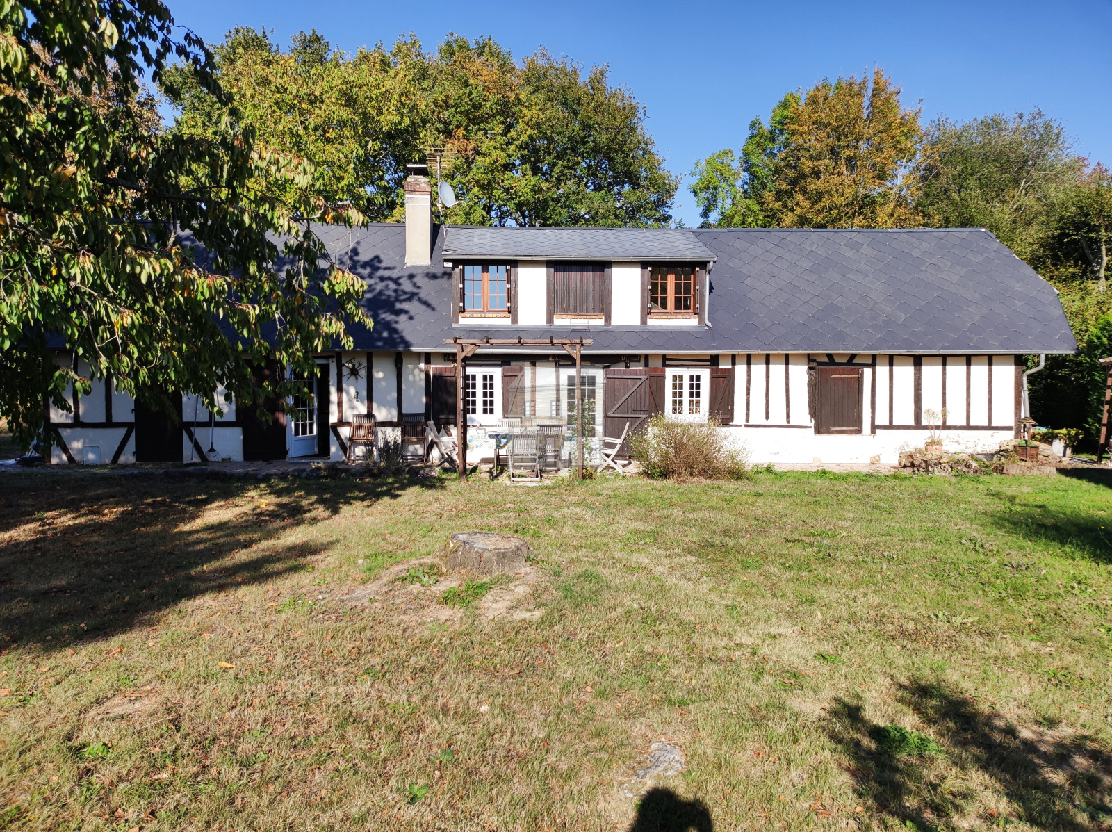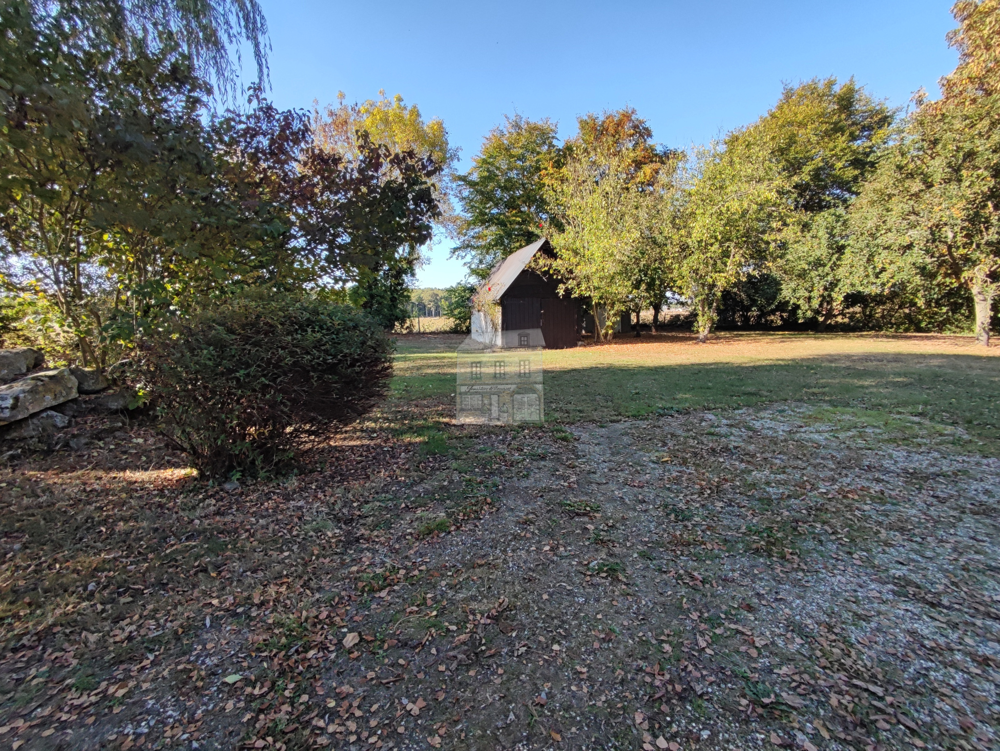 A l'extérieur la propriété s'étend sur plus de 2400m² de terrain arboré, agrémenté d'une jolie mare naturelle et entouré de champs, offrant un cadre bucolique et paisible sans vis-à-vis.