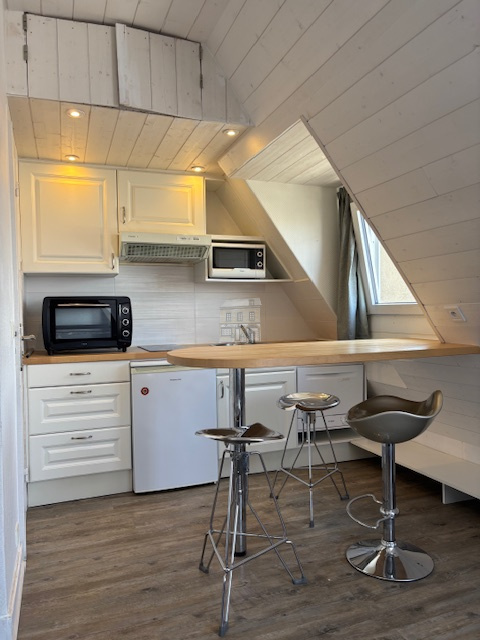 Il offre une pièce de vie lumineuse orientée plein sud, agrémentée d'une cuisine entièrement aménagée et équipée. L'espace a été intelligemment optimisé pour accueillir un coin nuit et la salle d'eau moderne dispose d'un WC sanibroyeur neuf.